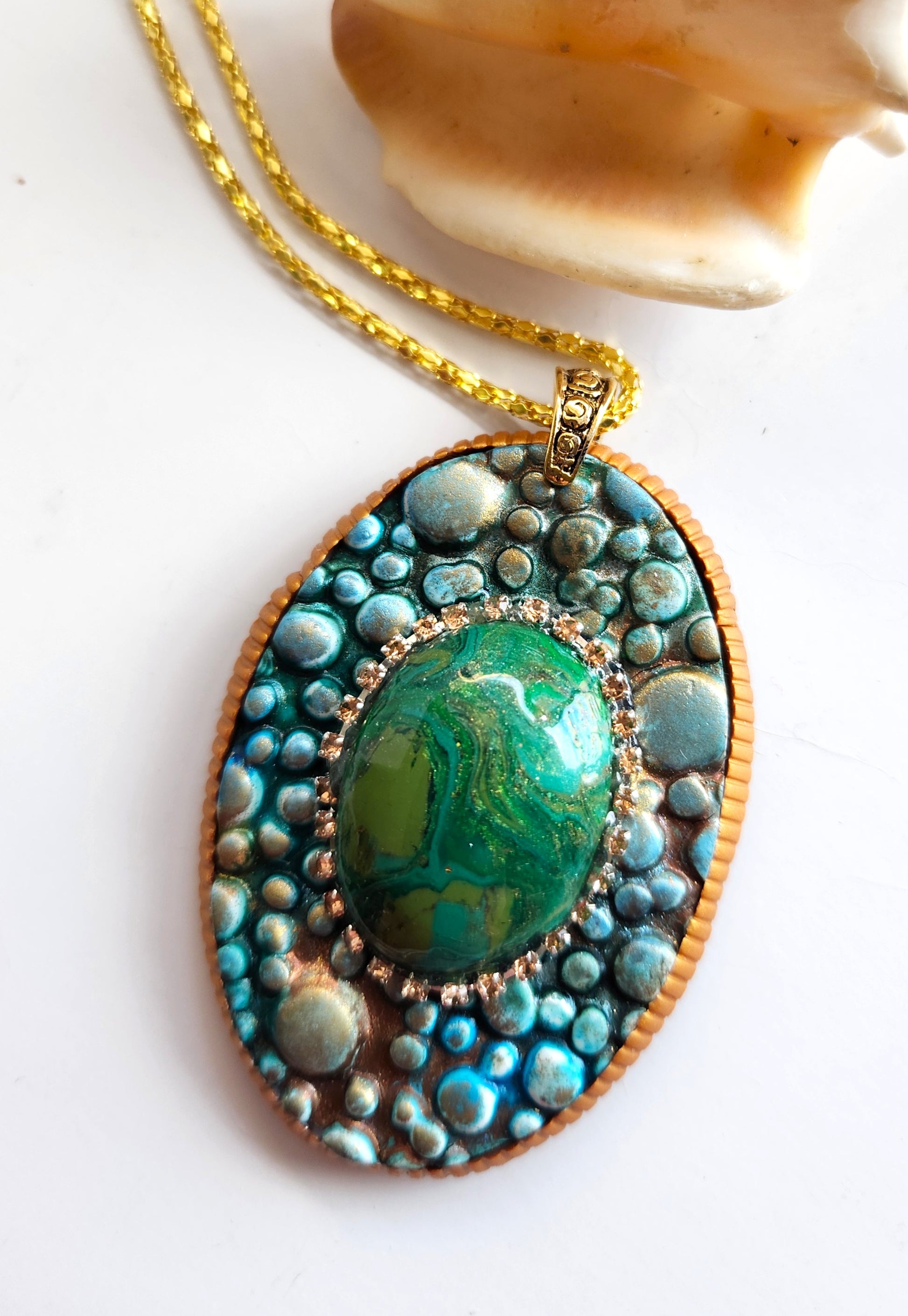 Introducing Aqua Bubbles - a luxurious pendant featuring beautiful green and aqua "bubbles" and a faux jade cabochon elegantly encased in a tiny crystal bezel. Channeling the world of art and fashion, this exclusive piece promises to add a touch of sophistication to any outfit. Elevate your style with Aqua Bubbles.