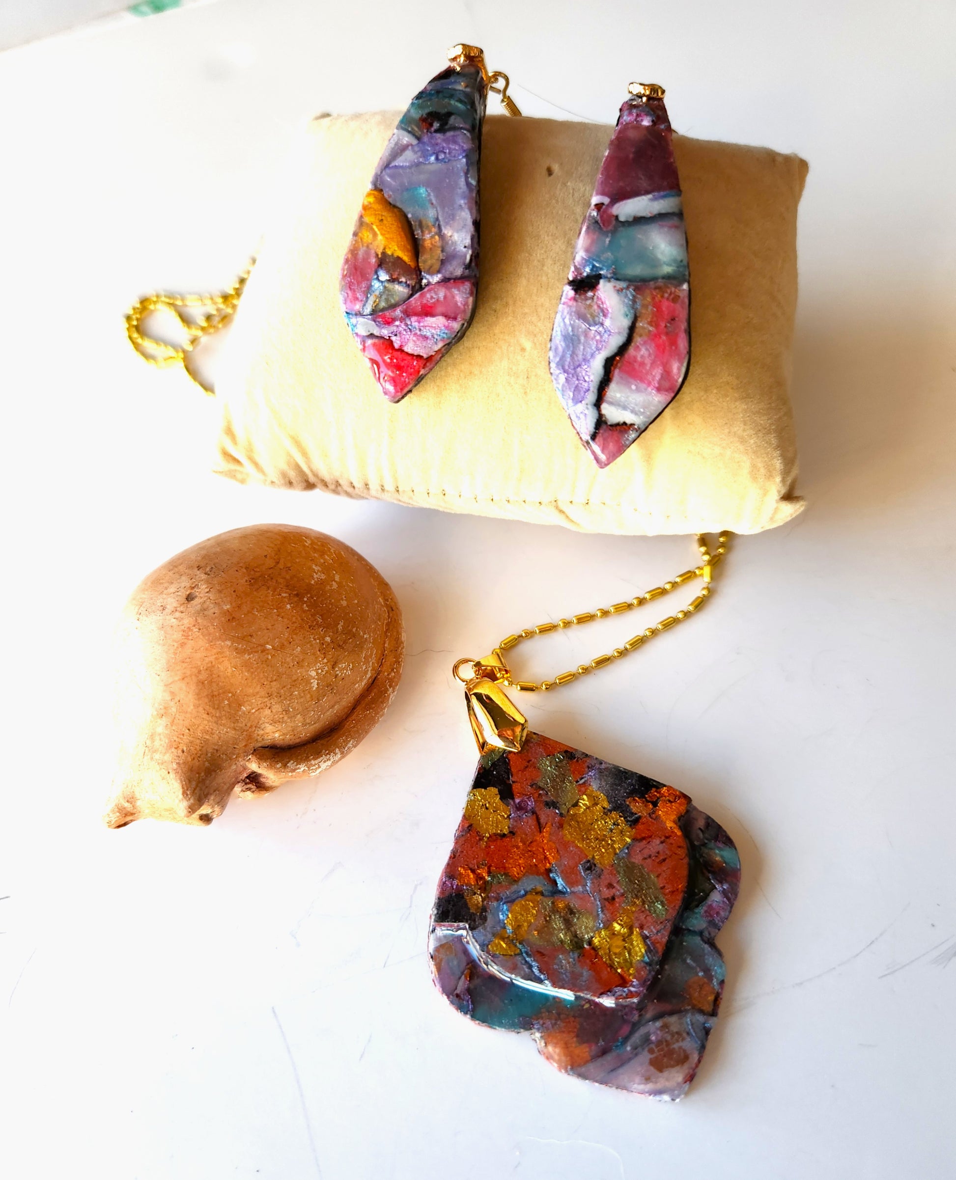 Transform any outfit into a masterpiece with our luxurious Colorful Cobblestones pendant and earrings. The multi-colored stones, delicately accented with shimmering gold leaf, add a touch of sophistication and elegance to your look. Elevate your style and make a statement with this exclusive set.