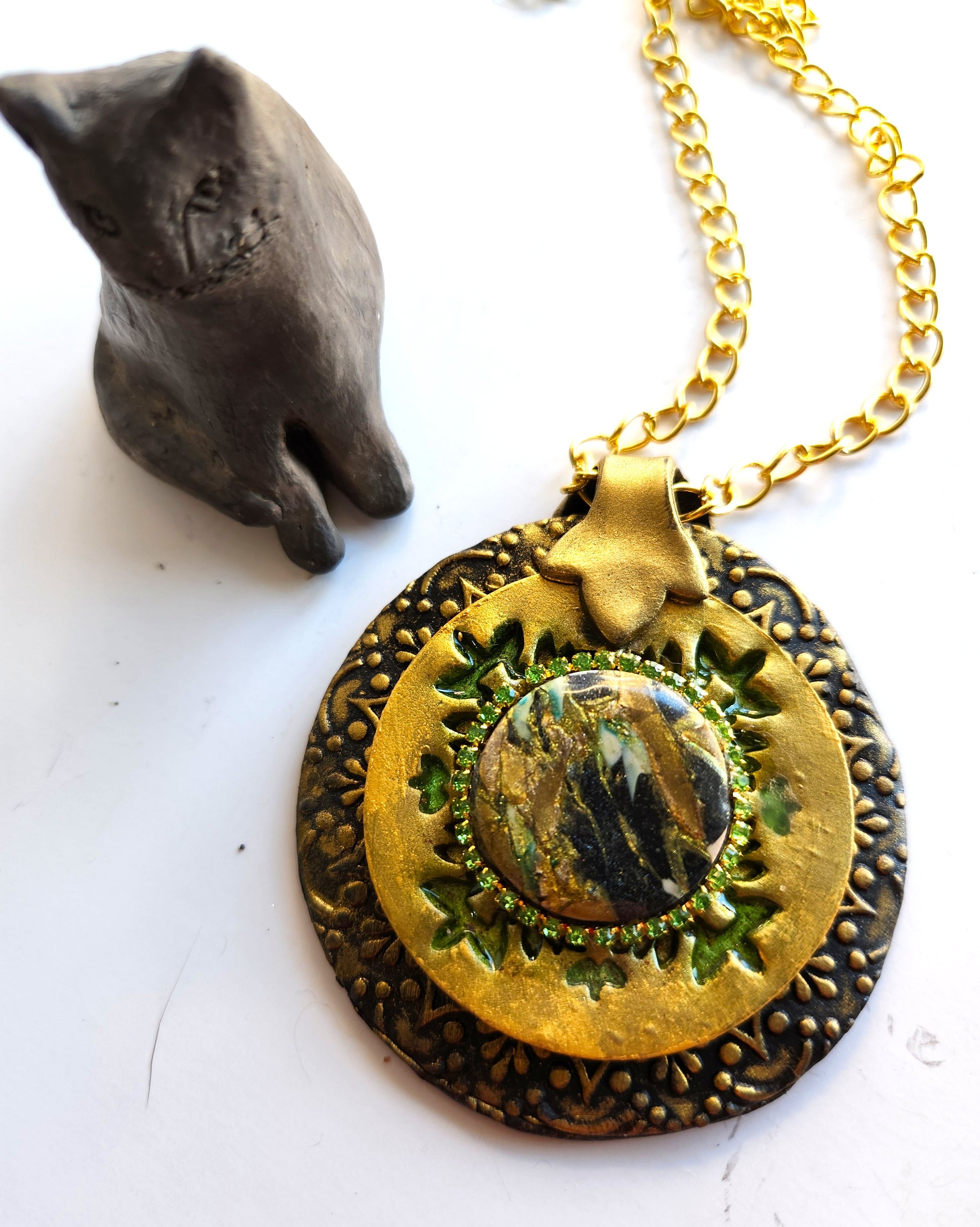 This pendant features a faux green and gold stone with a stunning green crystal bezel. Enhance your style and add a touch of mystique with this unique piece. Elevate any outfit with its elegant and eye-catching design.