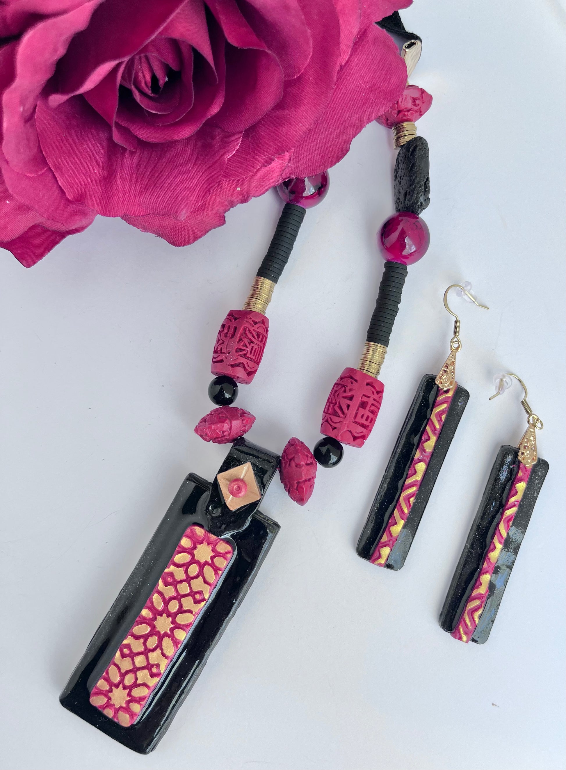 Unleash your adventurous spirit with our Memories of the Orient jewelry set, featuring intricate black, red, and gold designs. Take on new challenges and let this bold set inspire your journey. Length 22", Pendant 3" X 1".