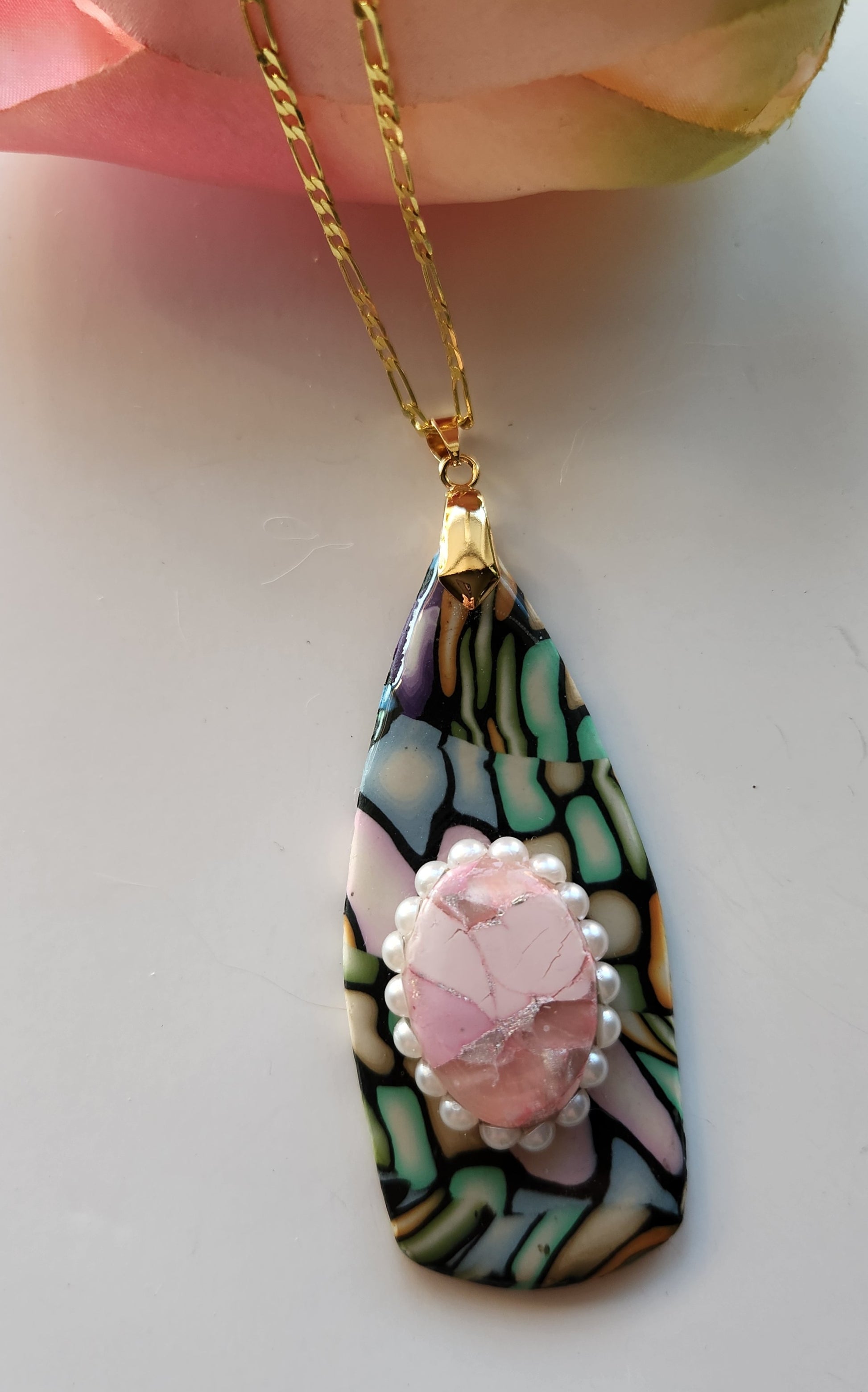 Indulge in the luxurious beauty of Spring Mosaic. The delicate pendant features a faux rose quartz cabochon in a pearl bezel, adorned with pretty pastel colors that evoke the essence of spring. Elevate your style with this elegant and exclusive accessory.