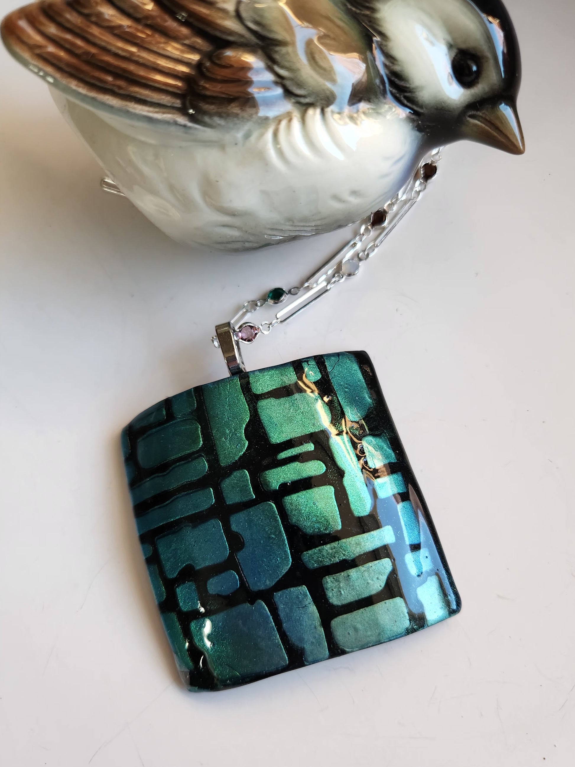 Indulge in luxury with our Tuile Pave' pendant. Crafted with shimmering green and blue irregular tiles, this exquisite piece is a testament to sophistication. Elevate any outfit with this elegant and exclusive pendant, a true work of art.